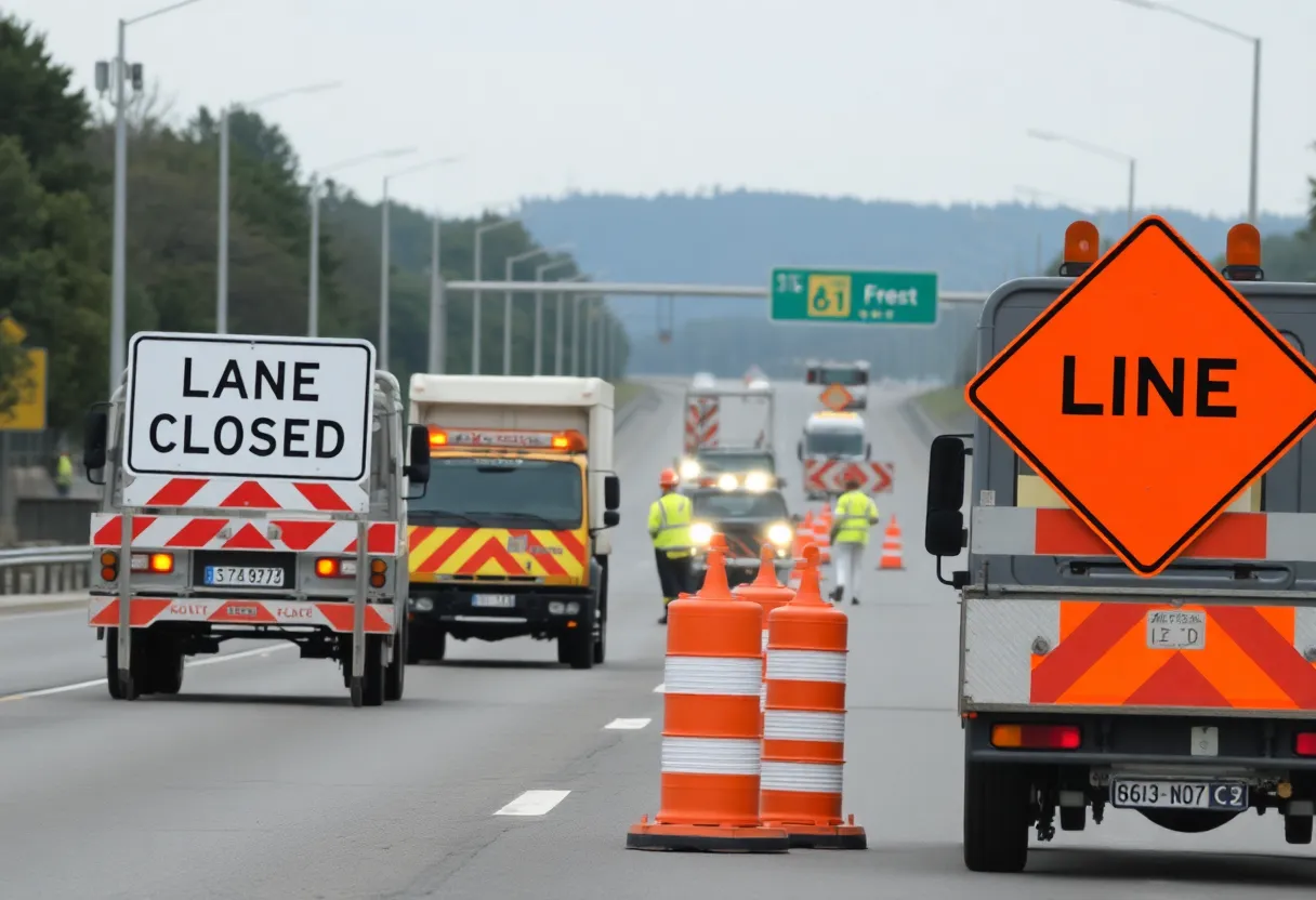 Construction workers and lane closure signs on I-26 highway